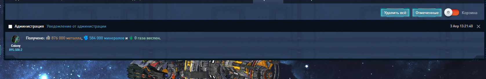 Но тут вопросик возникает, нюансик, рес этот был добыт по всем правилам, мы летели, тратили горючку, теряли часть флота. А получается, что мало того, что добытый лом изъяли, дык с меня еще сняли 1лям газа , как компенсацию видимо, дык еще и газ потраченный на этого пира, не вернули, 4 ляма газа в моем случае.