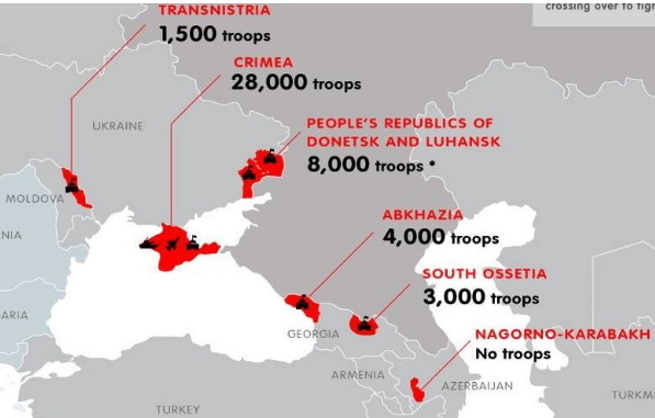 Военные базы РФ на оккупированных территорияхМолдавские "фашисты" напали на русских в расположении 14-й армии в Приднестровье, но обошли стороной Гагаузию. Грузинские "фашисты" появились в приграничных с Россией Абхазии и ЮО, но не тронули Аджарию. Украинские "фашисты" пытались уничтожить Крым и Донбасс (в которых националистов отродясь не бывало) и никого не тронули на Галичине - в самом сердце украинского "фашизма".Россия всегда спасает жителей территорий, которым угрожает “фашизм”. Если бы не вмешательство Кремля в Абхазии, там погибло бы столько же, сколько в Аджарии, в Приднестровье как в Гагаузии, а в Донецке пострадало бы от “фашистов” не меньше, чем во Львове. Взгляните на освобожденный Кремлем Сухуми. Сразу видно, что там был “фашизм”.