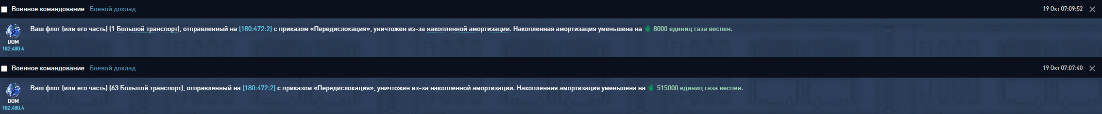 Появилась амортизация в количестве превышающем стоимость флота, при этом за несколько дней до этого, я мог свободно перемещаться передислокацией, а сегодня флот не может вылететь. В целом такого количества амортизации не могло скопится за такой короткий промежуток времени с учётом того флота который есть в наличии.