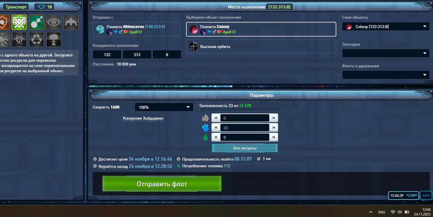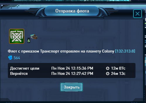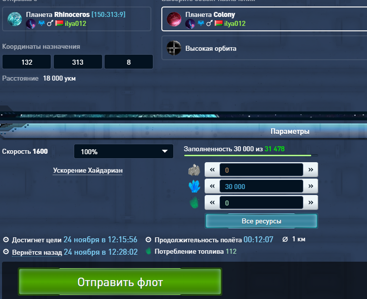 2 Скрин отправка флота с кол-вом ресурса, меньше чем было отправлено после ручного ввода объема рес.