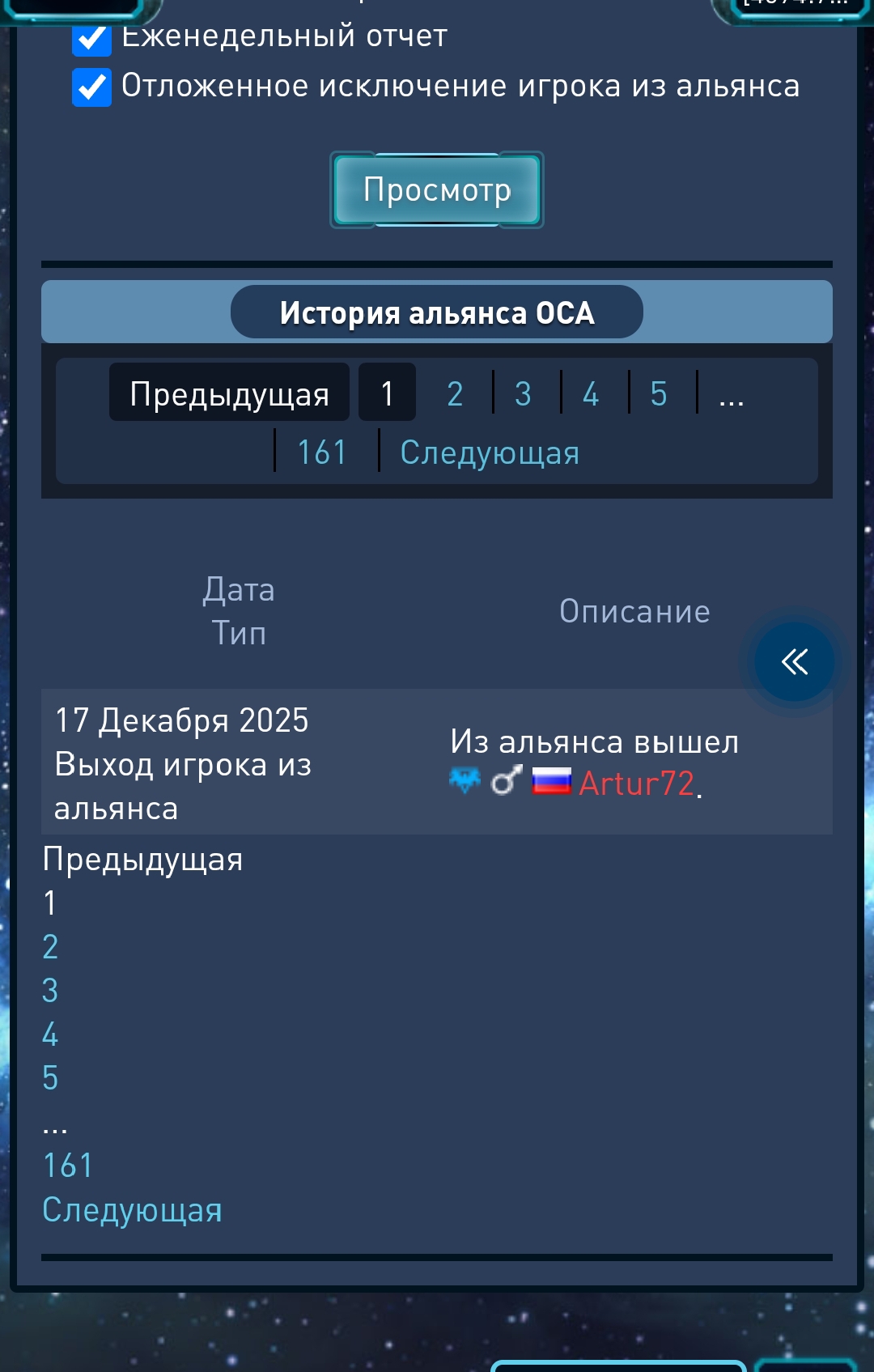 Открываем историю альянса и видим пустоту с перечислением страниц в столбик.