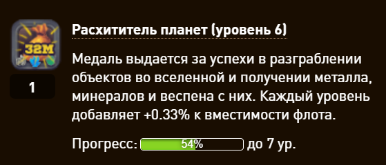 . Но почему-то медаль Мастер переработки, соответствующая данным требованиям при получении, не имеет процентную шкалу контроля. Пример -