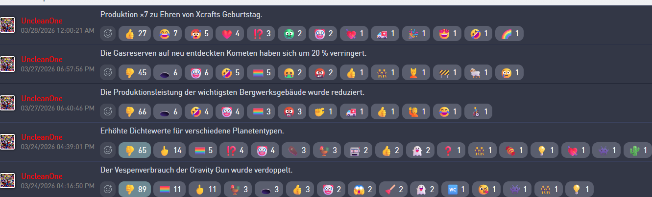 Sein Spieltrieb sieht so aus, dass er es genießt, wie Klugscheißer, die viel Geld investieren und denken dass es klug sei, versagen und irgendwann inaktiv werden - Und je größer und weiter, je interessanter ist der Untergang des Spielers - sein persönlicher Sieg über die scheinbare Klugheit des schnellwachsensten Spielers .... Er hatte keine Scheu gehabt, sogar den größten ehemaligen Spieler und Geldgeber von XCraft auszusperren (💲Altair743 - über eine halbe Milliarde Punkte groß auf Top 1 gewesen binnen weniger als einen Jahr Entwicklungszeitraum) und so derartig ihn zu missachten als Kunden, dass er sich direkt danach gelöscht hatte - und stolz war der Betreiber darauf, den größten sogar totgespielt zu haben....Ob wir posten, liken, disliken, pfurzen oder sonst was, das ist ihm egal!!!! Das sieht er nur als kleine Ausgaben von Hydariankristallen und etwas früheren Einkauf von neuen Hydariankristallen (und ist ebenso für ihn so ziemlich unbedeutend als Einnahmequelle).... Ich hab es ausgetestet und ihn ganz schön verbal verarscht und beleidigt - und siehe da, ich bin noch immer da und diese Beiträge sind auch noch immer da! Er hat mich nicht aus dem Spiel gesperrt (nur kurzfristig aus dem Forum und das auch nicht sofort, da musste ich schon sehr lange sehr nervig sein, dass er sich da eine Atempause mal holte)...... Das posten und Disliken ist ihm egal sozusagen - deswegen gibt es keine Updates..... Die Updates sind sein persönlicher Spieltrieb um Topspieler die Spiellaune zu verderben und sich daran zu erfreuen wie sie inaktiv werden und sterben (und genau deswegen werde ich nie inaktiv - die Genugtuung gebe ich ihm nicht)....