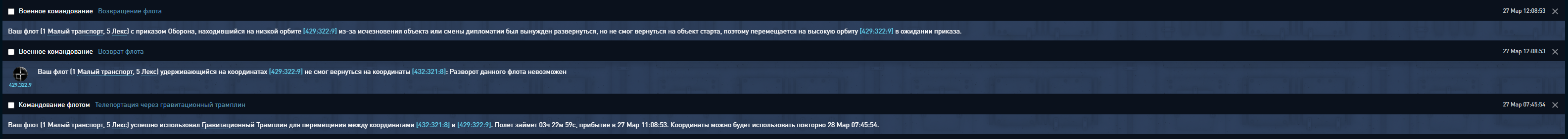 Флот отправлен через трамплины. После прибытия он пытается безуспешно развернуться и лететь обратно.В итоге получается на одной орбите с одинаковым приказом 2 флота одного игрока.