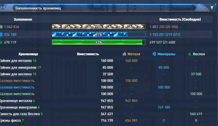 1 % не считается местом? Утащил... Оказывается не считается. Выработка появилась. ТО есть кроме выветривания в игре присуствует ещё и ни где не отображаемая, принудительная остановка выработки... Надеюсь, она просто при наполнении 99% отключается, в не замедляется , если в хранилищах стало более 50% )