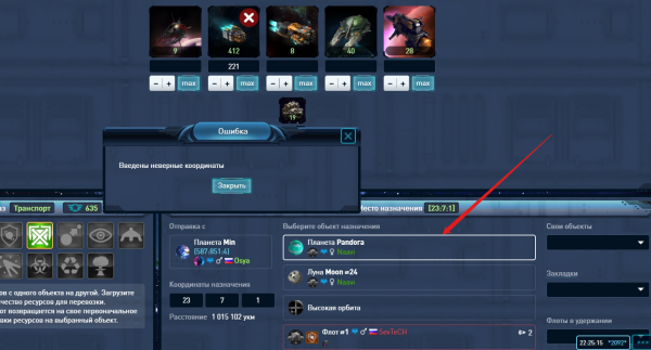 Маяк на высокой орбите планеты Пандора [23:7:1] устанавливается, планета становится видна, далее после попытки посылки со своей планеты ресурсов или атаки, пишет "Введены неверные координаты".